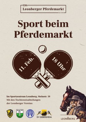 Beim diesjährigen Sportaktionstag des 330. Leonberger Pferdemarktes 2023 präsentieren sich die Tischtennisabteilungen der Vereine SV Gebersheim, TSV Höfingen, SpVgg Warmbronn und wir, die Tischtennisabteilung des SV Leonberg/Eltingen. Nach American Football und Basketball, rückt in diesem Jahr der kleine weiße Ball in den Fokus. Zum Mitmachen wird herzlich eingeladen. Das Tischtennis-Sportabzeichen kann erlangt werden. Wir freuen uns, gemeinsam mit unserem Nachbarvereinen diesen Sport näher zu bringen.